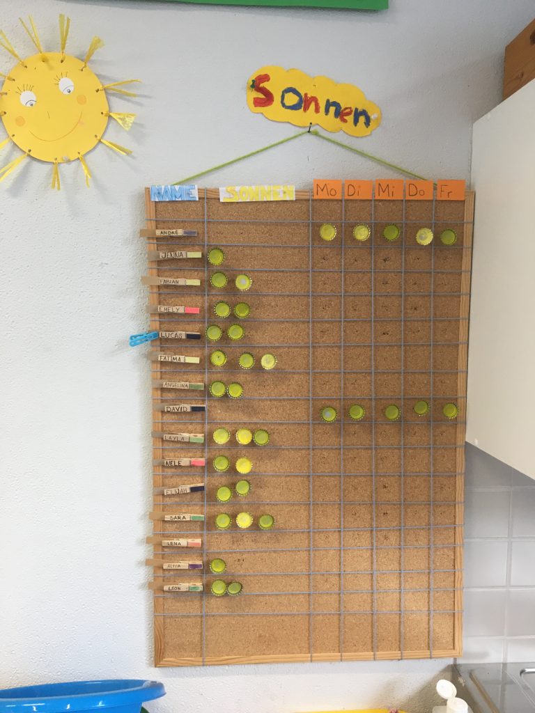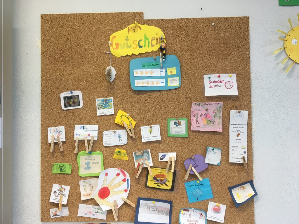 Das Belohnungssystem funktioniert durch eine Kombination von Selbsteinschätzung und Kontrolle durch die Klassengemeinschaft. Wer pro Woche für drei Tage eine Sonne erhält bekommt einen Gutschein. Die Arten von Gutscheinen werden im Klassenrat besprochen uns selbst gestaltet. Zum Zeitpunkt der Hospitation gab es z.B. Gutscheine für Henna-Tattoos, Benutzung eines Drehstuhls, Kochen für die Klasse, Laptop-Nutzung, Kunststücke mit Schulhund Milo, Billard in der Pause. Die Klassenregeln waren: Melden, Leise sein, Respekt, Zuhören, Ordnung halten und zuerst lernen. Ich merkte, dass die Klassenregeln eigentlich fast überall gleich sind, besonders auch wenn sie in einem demokratischen Prozess (Klassenrat) gemeinsam von den Schüler*innen festgelegt werden. Eine Besonderheit ist in dieser Klasse ein Joker, den die Schüler*innen am Anfang oder während des Schultages ziehen können. Wenn sie spüren, dass es schwierig wird alle Regeln eizuhalten, können sie um ein „Polster“ bitten. Dann nehmen sowohl Lehrer*innen, als auch Mitschüler*innen besonders Rücksicht auf sie.