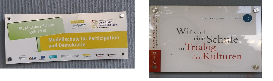 Es ist inzwischen üblich, die Schwerpunkte einer Schule, die sich oft auch durch Teilnahme an Wettbewerben, Landesprogrammen oder Förderung durch Stiftungen zeigt, mittels entsprechender Schilder an der Schulpforte zu zeigen. So fällt vor Betreten des Schulgebäudes zunächst die Auszeichnung als „Modellschule für Partizipation und Demokratie“ ins Auge. https://www.modellschulen-partizipation.de/